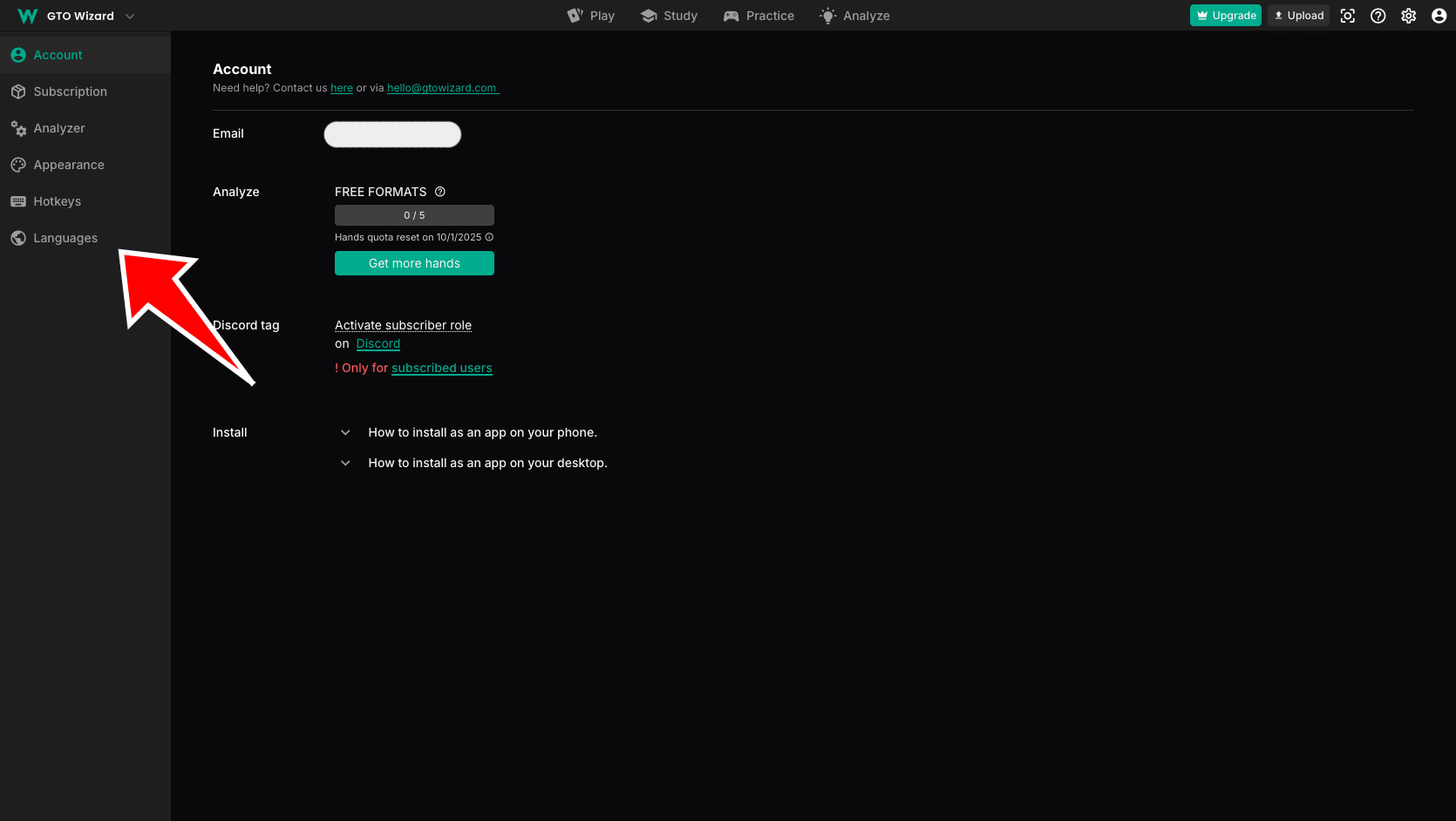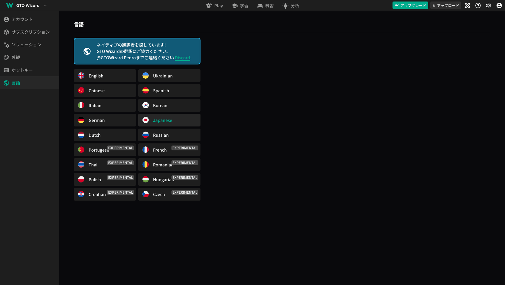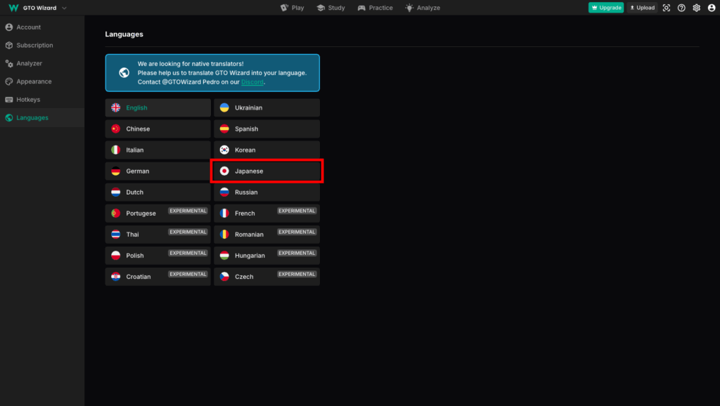 GTO Wizardを英語の公式サイトから、利用を始めた方は言語設定が英語になっているかもしれません。その場合は、下記の手順に沿って日本語化対応をしておくといいでしょう。